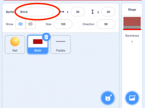 We will not need three types of sprites to play: a ball, a brick and a racket. You can use the ‘Ball’ sprite from the Scratch library but you will need to draw the other two. For this, click on the paintbrush icon and draw a brick and a racket.