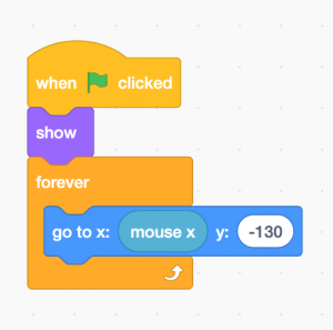 We need to be able to move the paddle according to the position of the cursor. Choose the ‘Paddle’ sprite and add the below blocks to its script by clicking on the ‘Code’ tab near the top left of the screen.