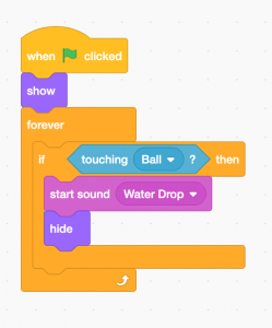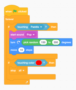 At this stage, the ball will stay in the playing field, but will pass through the other sprites. For the game to work, it needs to bounce off the paddle (while making a sound effect) and bring about the end of the game if it touches the bottom of the screen (distinguished from the other edges by the red bar). Add the following blocks: