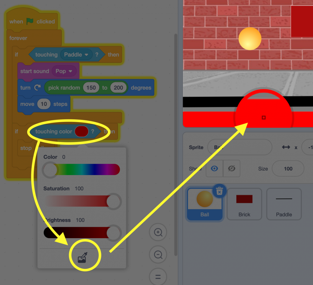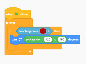 Click on the green flag to test the result. The ball continues on its route, destroying all bricks it touches. It would work better if it ‘rebounded’ in a random direction to imitate the physical effect of hitting the brick. Add the following blocks to the ball’s script (use the eyedropper tool as before to copy the bricks’ colour).