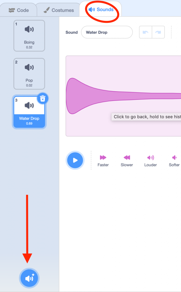 We now have to make it so that the brick disappears and produces a sound effect when it is touched by the ball. To use different sound, go to the ‘Sounds’ tab near the top left of the screen. Click on the speaker icon on the bottom left of the screen, then choose a sound effect from the library.