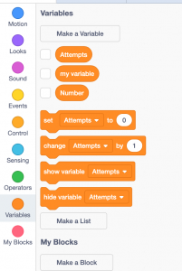 Go to the variables tab and click ‘Make a Variable’ and name it ‘Attempts’.