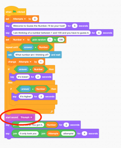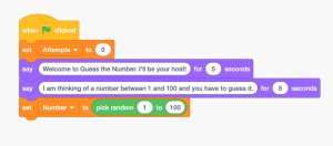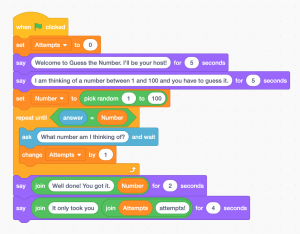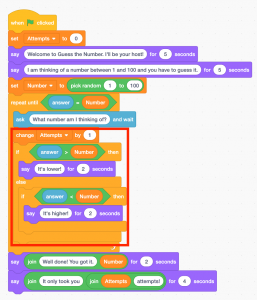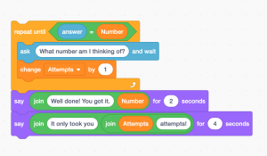 Code explanation: the game will ask the player to guess the number until the answer is equal to the correct one. It will increase the attempt counter after each incorrect try. Once the number guessed is equal to the target number, the sprite speaks confirms the correct answer. Then it will say how many attempts were needed.