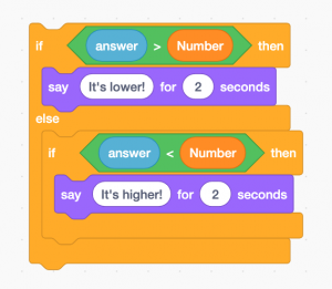 If the player’s response is higher than the target, the sprite will say ‘it’s lower’ and vice versa. Integrate the blocks with previous as follows: