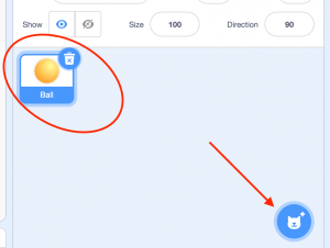 2. Next, we will need to insert a ball. Click on the sprite icon and then ‘Choose a sprite’. Then choose ‘Ball’ which can be set to have several colours.
