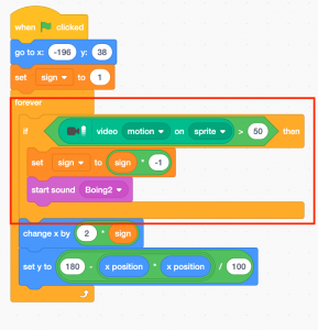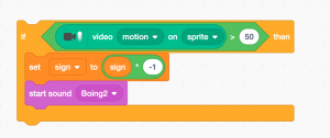 ‘If the video motion on sprite > 50’ means you want the player to touch the ball with a certain intensity; the number 50 corresponds to a fairly stern motion. By changing the value of sign, you can slow down or speed up the ball.