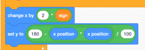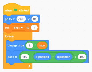 When the flag is clicked, the value of the variable ‘sign’ is set at 1. The ball is placed at the left of the stage, then advances 2*sign thus making a parabola.