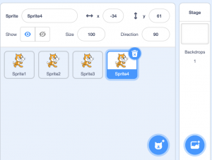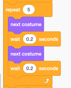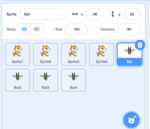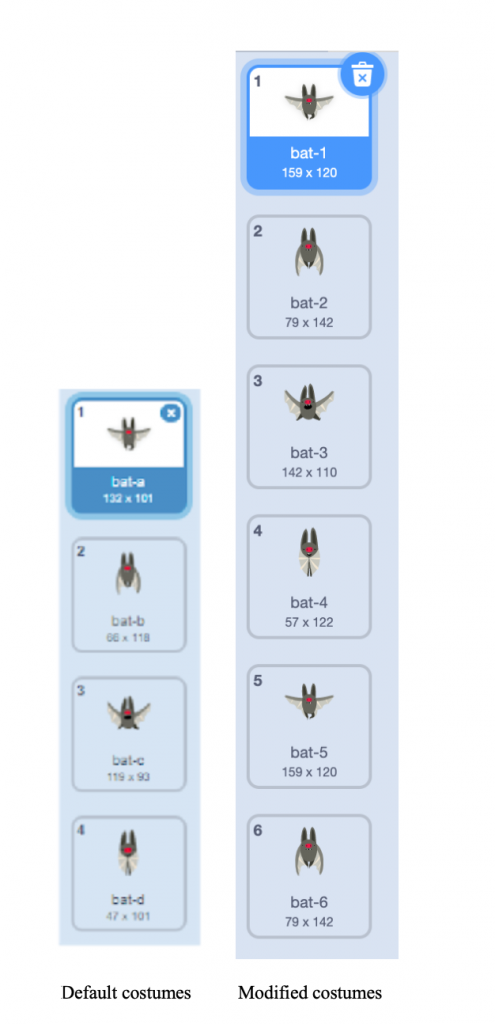 This sprite will have four costumes to animate it in order to give the impression that it’s flying. It is possible to modify the position of the costumes and to duplicate others in order to make the animation more fluid.