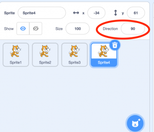 Each sprite needs to have a different orientation. In Scratch 3 the orientation of the sprites is modifiable in the Direction field in the area containing Sprite info (above the Sprite area).