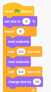 When the program starts, the cat will begin at 0% of its initial size, meaning it won’t be visible onscreen. It will grow gradually (‘set size to 0%).