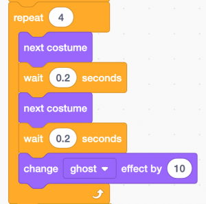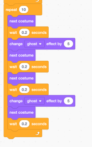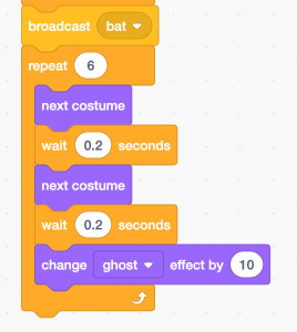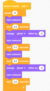 This is to make the cat sprite disappear gradually from the screen through the use of the ghost effect (‘change ghost effect by 10’). The cat will be replaced by a bat.