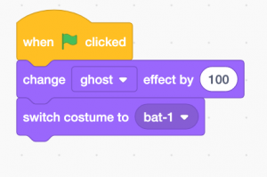 This is the initiation. At the beginning of the program, the bat sprite is not visible (‘change the ghost effect by 100’)
