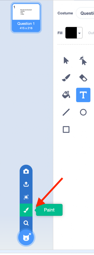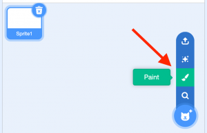 To make a question, create a new sprite by hovering over the icon near the bottom right of the screen and then clicking on ‘Paint’.