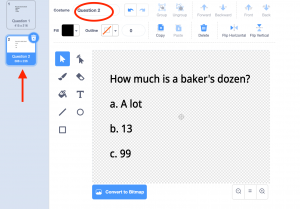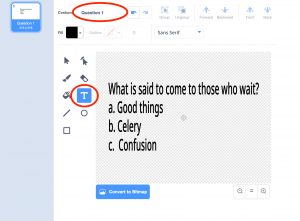 The question will be one of the sprite’s costumes. Under the ‘costumes’ tab, click the T icon to add text. Then write a question and three possible responses (only one should be correct). Name the costume ‘Question 1’.