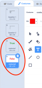 Now you need to create two costumes – ‘true’ and ‘false’ – this time by using coloured text (so that true and false are different colours). In this example, the questions are black, true is green and false is red.