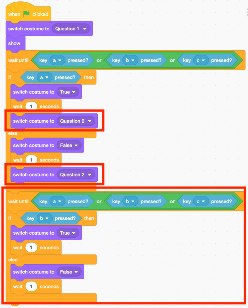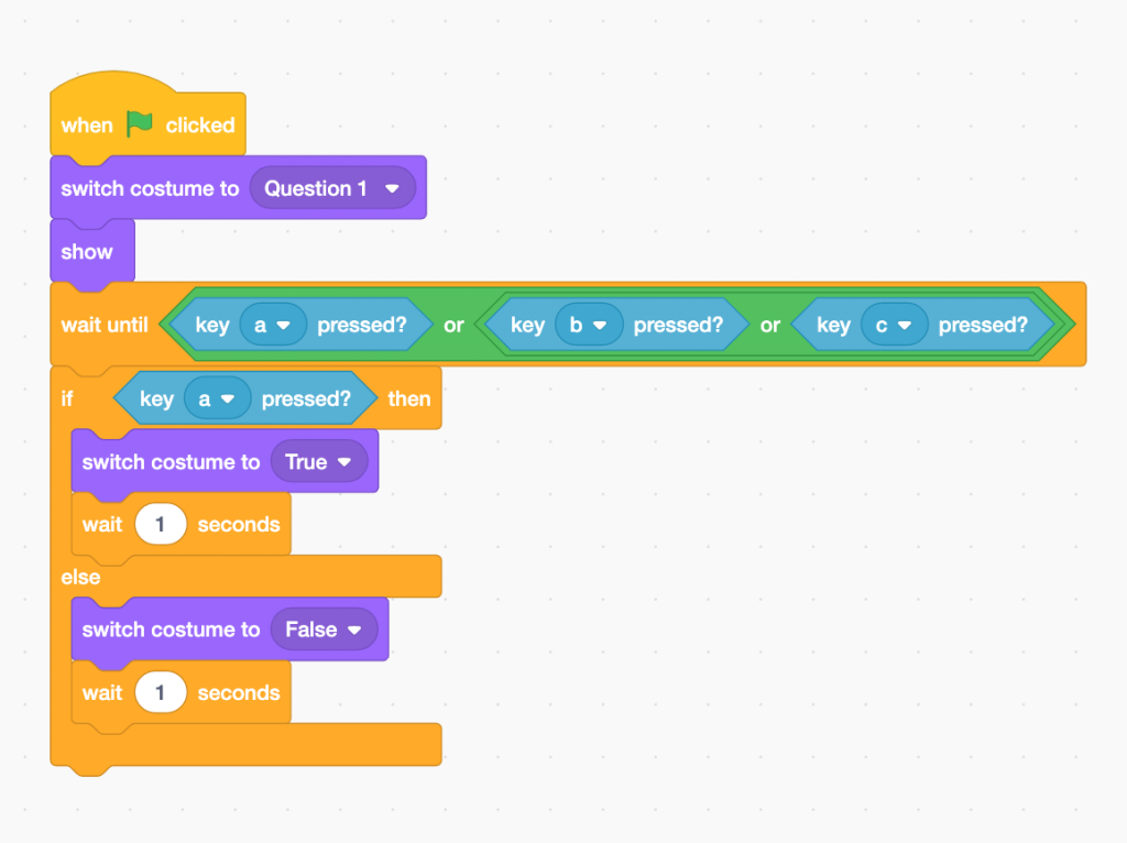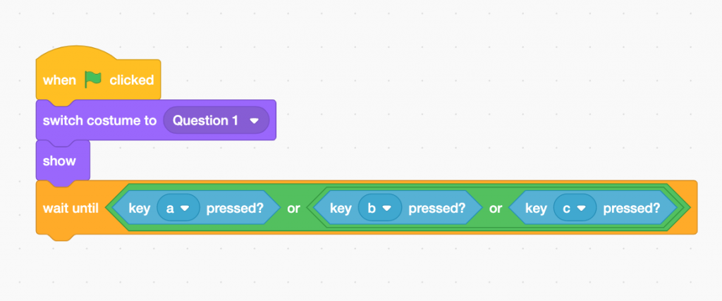 Code explanation: when the green flag is clicked, the sprite changes to the costume ‘Question 1’ and so the first question appears. The script stops until the player press a, b or c on the keyboard.