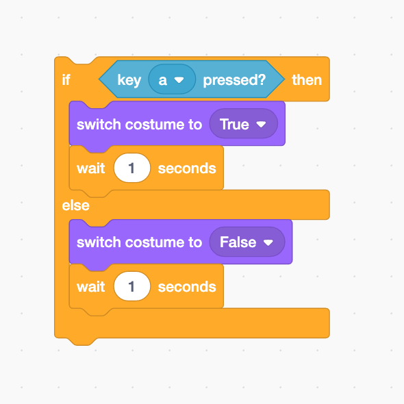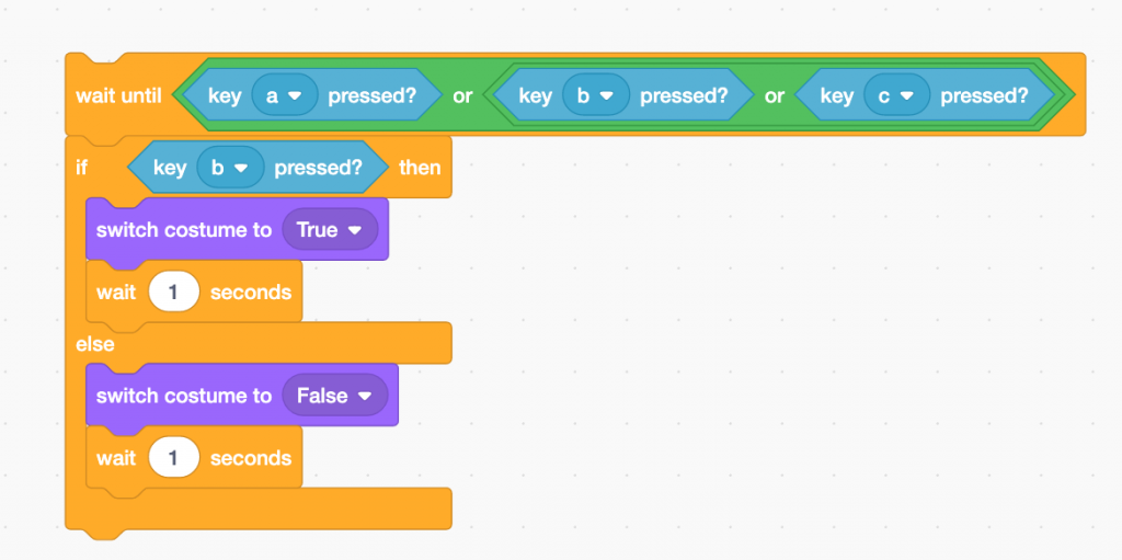 Code explanation: if the player press ‘a’ (the right answer in this example), the costume changes to ‘true’ and stays in this state for 1 second. If the player chooses either of the other 2 possibilities, the script changes the costume to ‘false’ and waits 1 second.