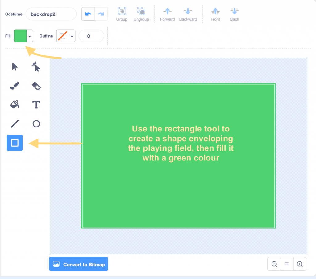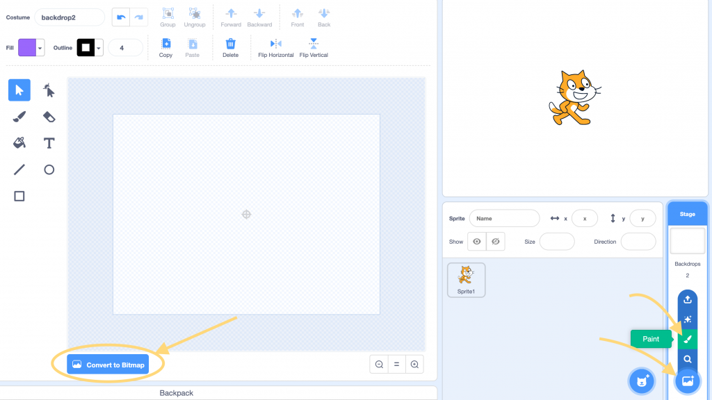 - Create a new Scratch project and hover over the backdrop icon (bottom right of the creation screen), then click the paint icon.