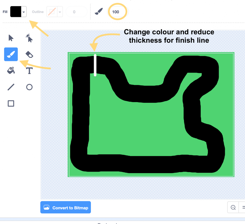 - Fill with green, then draw a black track using the paintbrush of maximum thickness. With a thinner line of a different colour, draw a straight line corresponding to the arrival line.