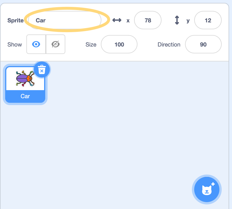- Delete the default cat sprite by click it and selecting the trashcan that appears over its selection pane. Create a new sprite representing a car but choosing an image from the library (click the cat-shaped sprite icon near the bottom right of the screen). Choose something small rather than something long or pointed – it will be easier to program. Here we have chosen ‘Beetle’.