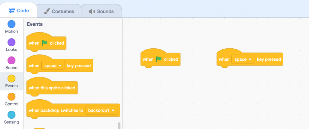- Yellow for events which start block sequences, for example when the player clicks on the green flag or presses the space key.