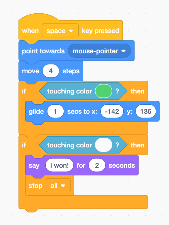 - Inside the test block, duplicate the block that sends the car to the starting point. This block will only be executed if the test’s condition is met (i.e. if the car is touching green).