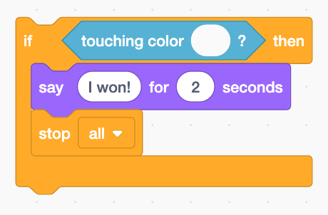 - Inside this, place the block that displays ‘I won’, then add ‘stop all’.