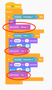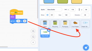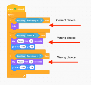 When the player clicks the green flag, the programme constantly checks the following conditions: if Plastic Bottle (in this case) touches Recycling, then it disappears. If it touches Trash, then it says indicates in the form of a speech bubble that it’s a wrong answer and moves back to the position indicated.