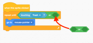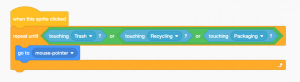 We will next need to tell the computer that the trash can be dragged towards the bins using the mouse. In order to not have all the trash follow the cursor at the same time, use the block ‘when this sprite clear’, Next, add the conditional loop (‘repeat until’) that verifies that the three bins (‘touching recycling’, ‘touching trash’ and ‘touching packaging’). To add three conditions, insert the ‘…..or…..’ blocks as below. Complete the loop with the moving of the cursor (‘go to mouse pointer’).