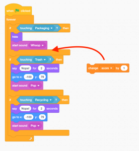 In the trash’s script, add a point to the score when the correct bin is used, as follows: