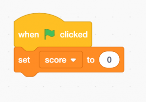 At the beginning of the game, the score should be at zero. Add the following blocks to the stage’s script:
