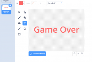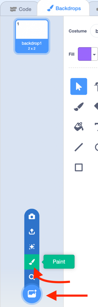To indicate that the game is finished, we can display ‘game over’ text when the timer reaches 0. Go to the ‘Backdrops’ tab on the top left and add a costume that you will draw yourself. Choose a colour and write ‘Game Over’ with the text tool (‘T’ icon).