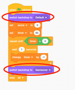 When the green flag is clicked, the default backdrop appears. The variable ‘score’ is set to 0 and ‘timer’ to 60. Then ‘timer’ will lose 1 every second until it is equal to 0. Once equal to 0, the backdrop ‘Gameover’, the program stops.