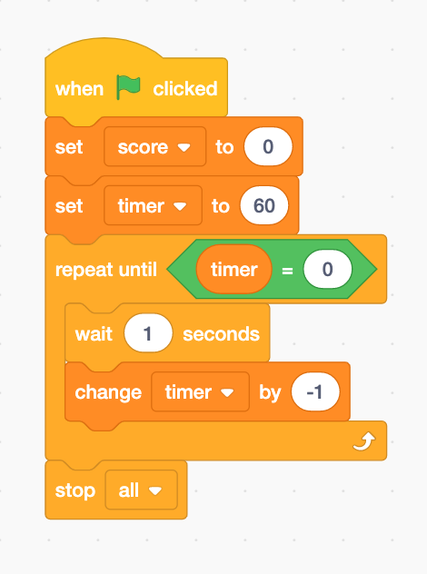 When the green flag is clicked, the variable ‘score’ is set to 0 and ‘timer’ to 60. Then ‘timer’ will lose 1 every second until it is equal to 0. Once equal to 0, the program stops.