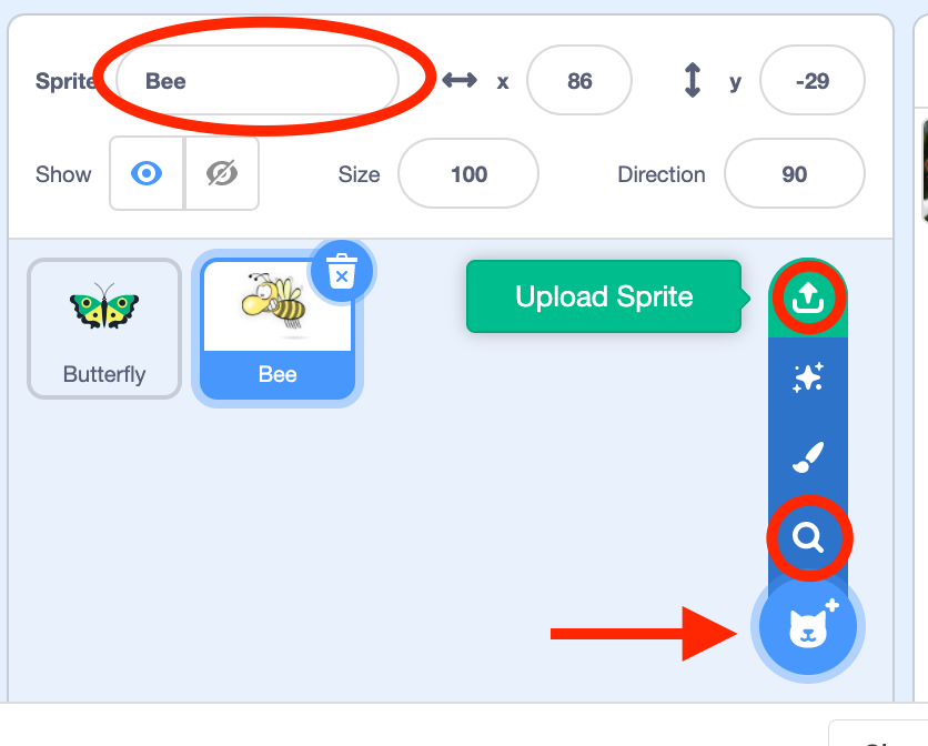 1. Add the sprite ‘Butterfly 1’ from the library and a ‘bee’ (found here) Click on the sprite icon and then the search icon and upload icon to import from the Scratch library and your hard drive respectively. You can alternstively use other creatures. Rename your sprites to ‘Butterfly’ and ‘Bee’ (by clicking on the box above the sprites).