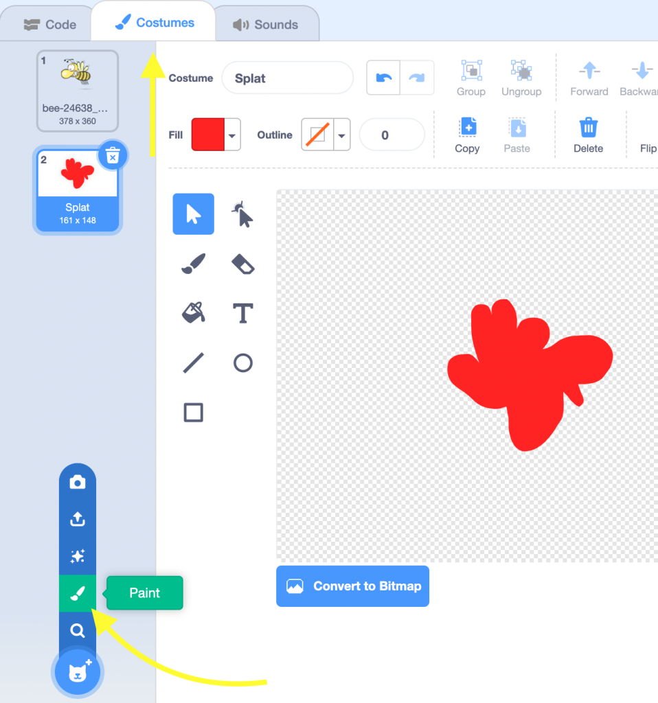 2. We now need to create a second costume for each sprite. We will draw them ourselves by clicking on the paint icon. Draw a kind of ‘splat’ shape symbolising the crushing of the poor insect.