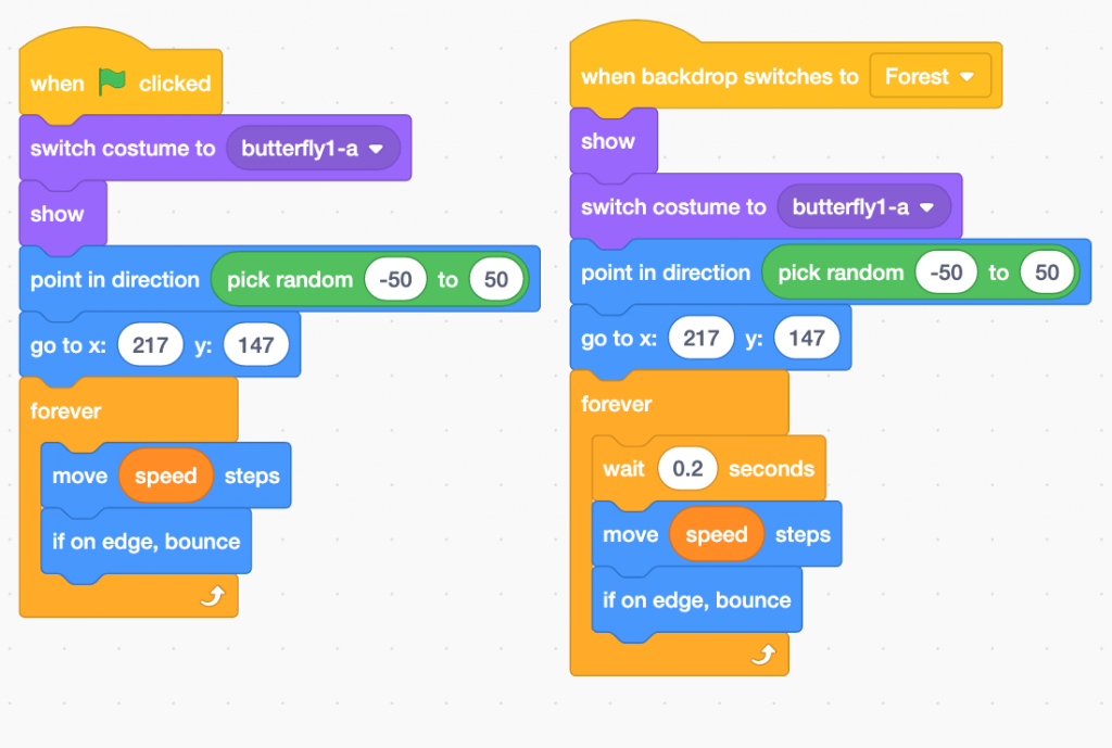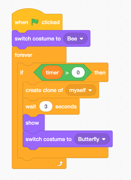 3. Copy these to block groupings to the bee’s script. For the bee, change the code slightly so that the costume changes to ‘Bee’ instead of ‘Butterfly’.