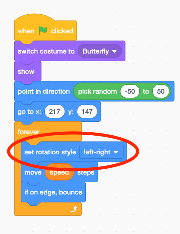 4. The sprites can now move in all directions and will sometimes be upside down through their movements. To avoid this, add a ‘set rotation style left-right’ block to each of the block groups you just made. See the circled block below and make sure to add it to each group (i.e. two groups for the butterfly and two for the bee).