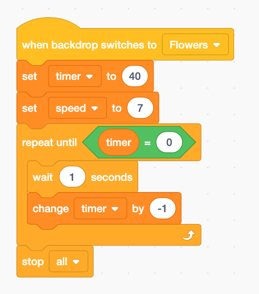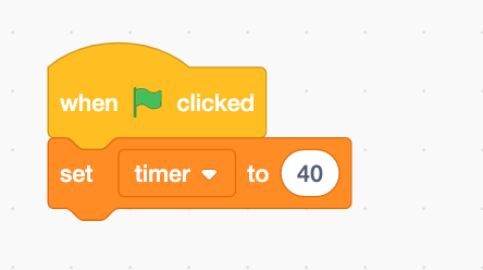 When the green flag is clicked, the variable ‘timer’ will be set to 40. You can modify the value of ‘timer’ as you wish.