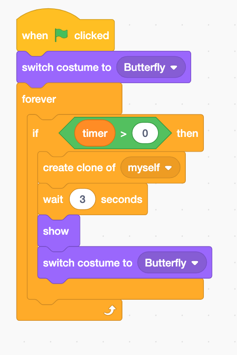 1. To make the game more fun, we will clone the sprites. To begin, write the following code to the butterfly’s script: