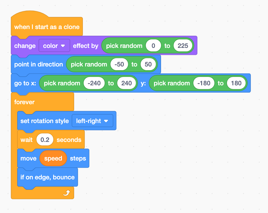 3. To be able to interact with the clone, we have to use the block ‘when I start as a clone’. In your example, we would use the following code: