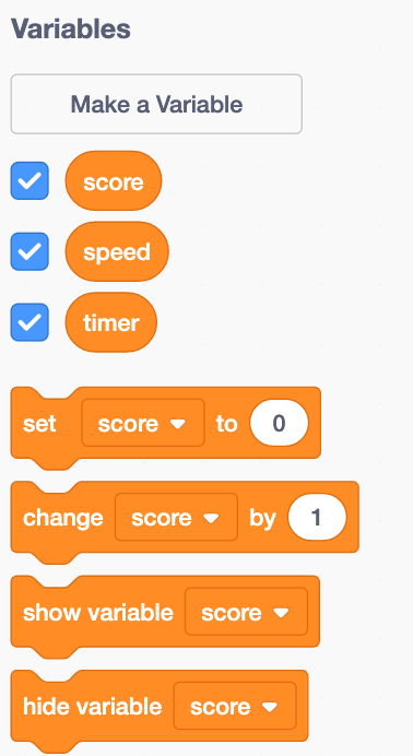 1. Add another variable applied to all sprites, calling it score. We should now have three variables.