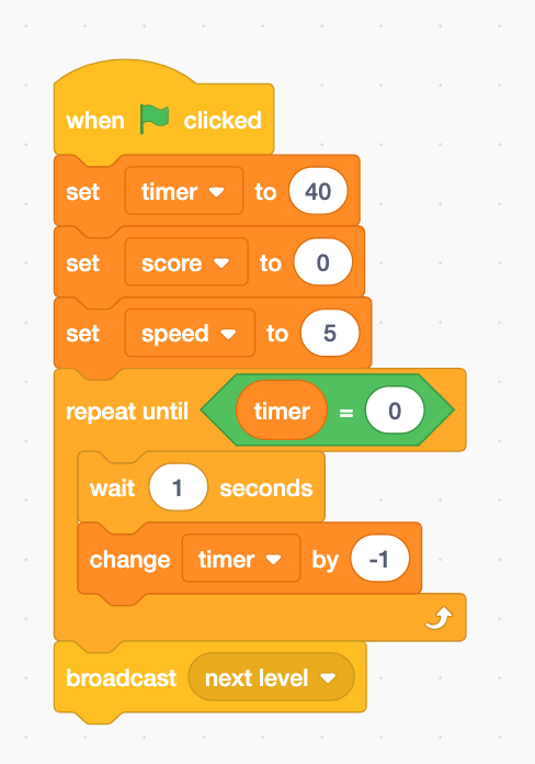 When the green flag is clicked, the variables are set at their defined values. Then, the ‘timer’ variable will lose 1 every second until it is equal to 0. From then on, the ‘next level’ message is sent which will allow the program to change the relevant elements.