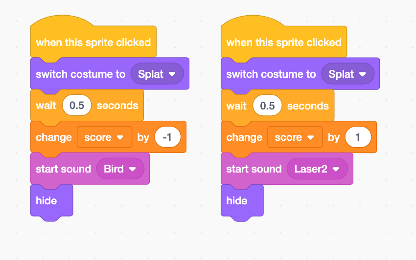 When the player clicks on a sprite, it will change to the ‘splat’ costume, wait a half second before removing 1 from the variable ‘point’ (if it’s the butterfly) or adding 1 instead (if it’s the bee) and play a sound (‘bird’ for the butterfly or ‘laser 2’ for the bee). Finally, they will disappear.
