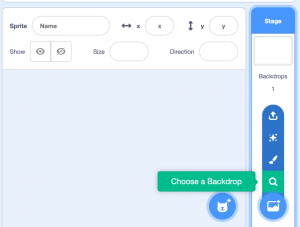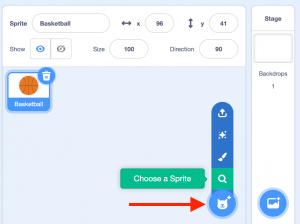 Add a sprite by clicking on the icon near the bottom right of the screen. Choose the default costume from the library, for example ‘Basketball’.