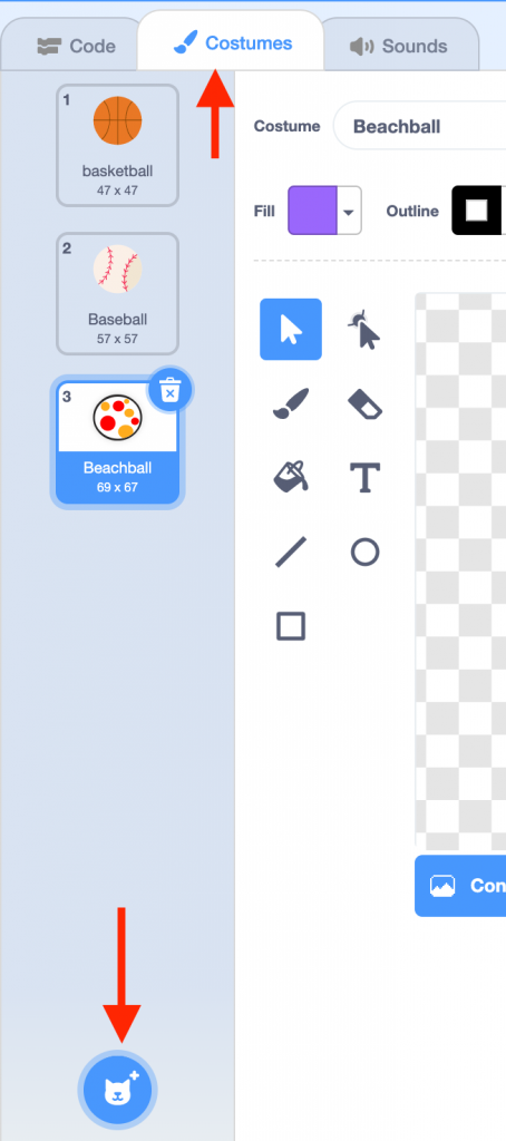 Click on the ‘Costumes’ tab on the top left of the screen and choose two extra costumes by clicking on the sprite icon, this time on the bottom left.