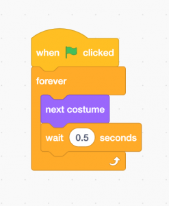 When the player clicks the green flag, the sprite changes its costume and waits 0.5 seconds. This repeats indefinitely.