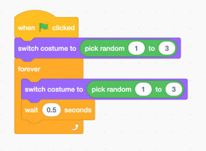 When the player clicks on the green flag, the sprite starts its animation randomly with one of the three costumes. It will then indefinitely repeat the cycle of waiting 0.5 seconds and then changing.