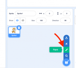 - Click on the ‘create a new sprite’ icon, then ‘Paint’. Name the sprite ‘Snake’. Delete the cat.