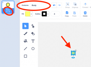 - Start with the body. Draw a black circle and fill it with yellow. Have it so that the size of the body doesn’t pass 30 pixels. For this, look at the costume icon on the top left of the screen: if you shrink or enlarge the drawing, the pixel values change. In this example, the body is 25×25. Name the costume ‘body’.